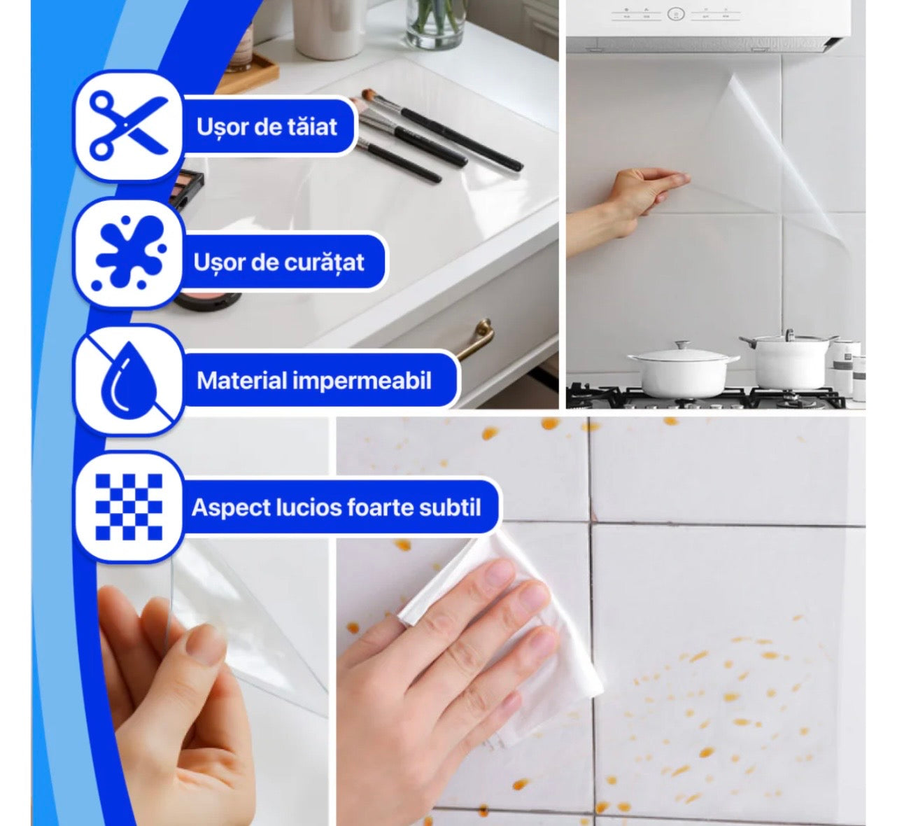 „ Am comandat produsul pentru că mă săturasem ca peretele să se murdărească de fiecare dată când găteam. Aplicarea a fost rapidă, fără bule, și până acum nu s-a dezlipit deloc. Este o soluție practică dacă nu vrei să faci modificări costisitoare."