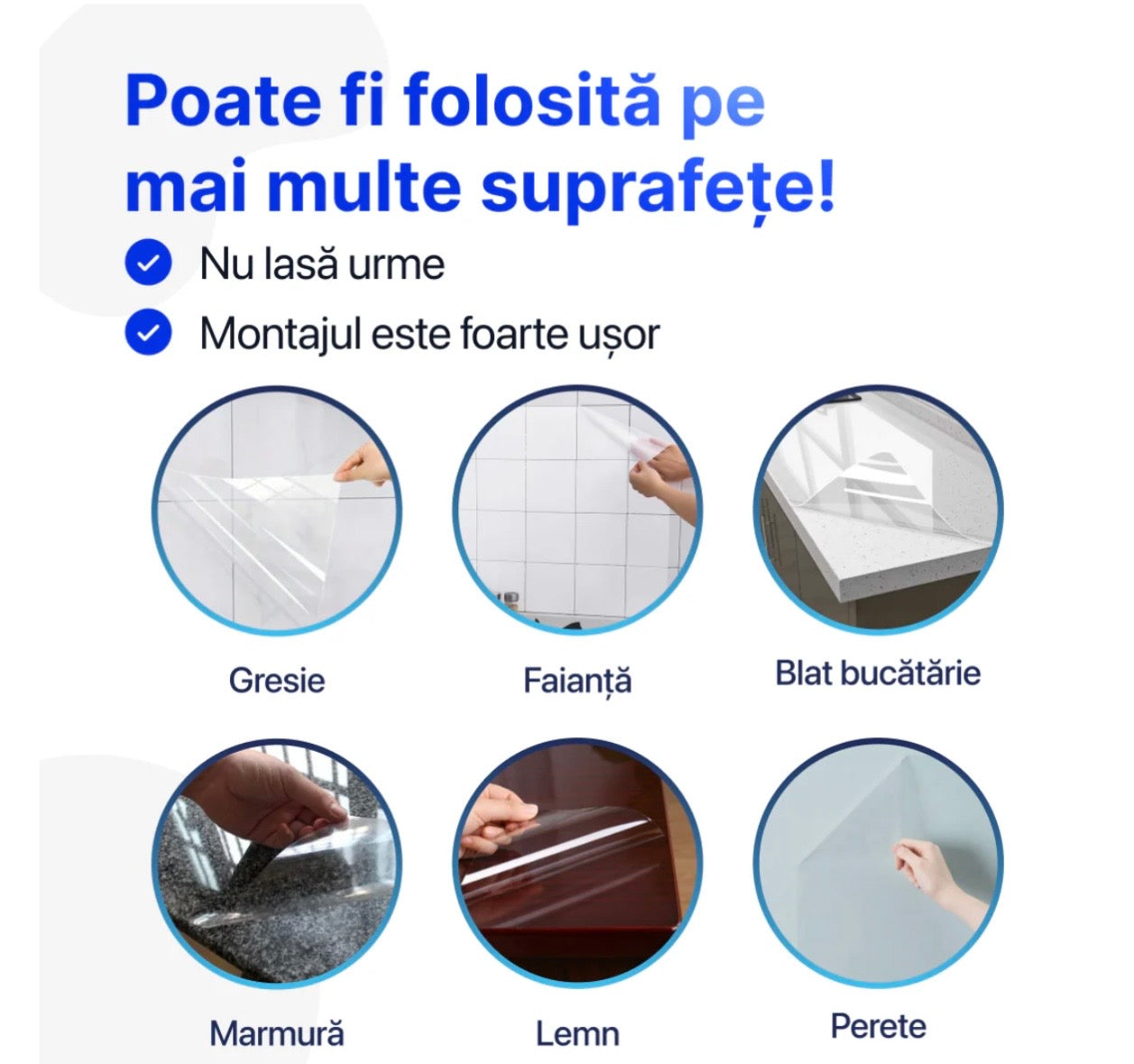 Folia poate fi folosită pe diverse suprafețe și rezolvă mai multe probleme deodată. Este alegerea perfectă acolo unde curățenia și întreținerea ușoară sunt importante.
